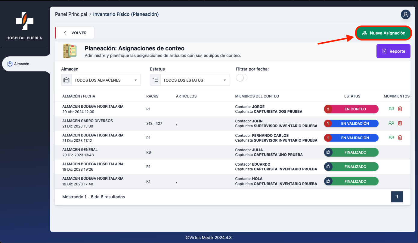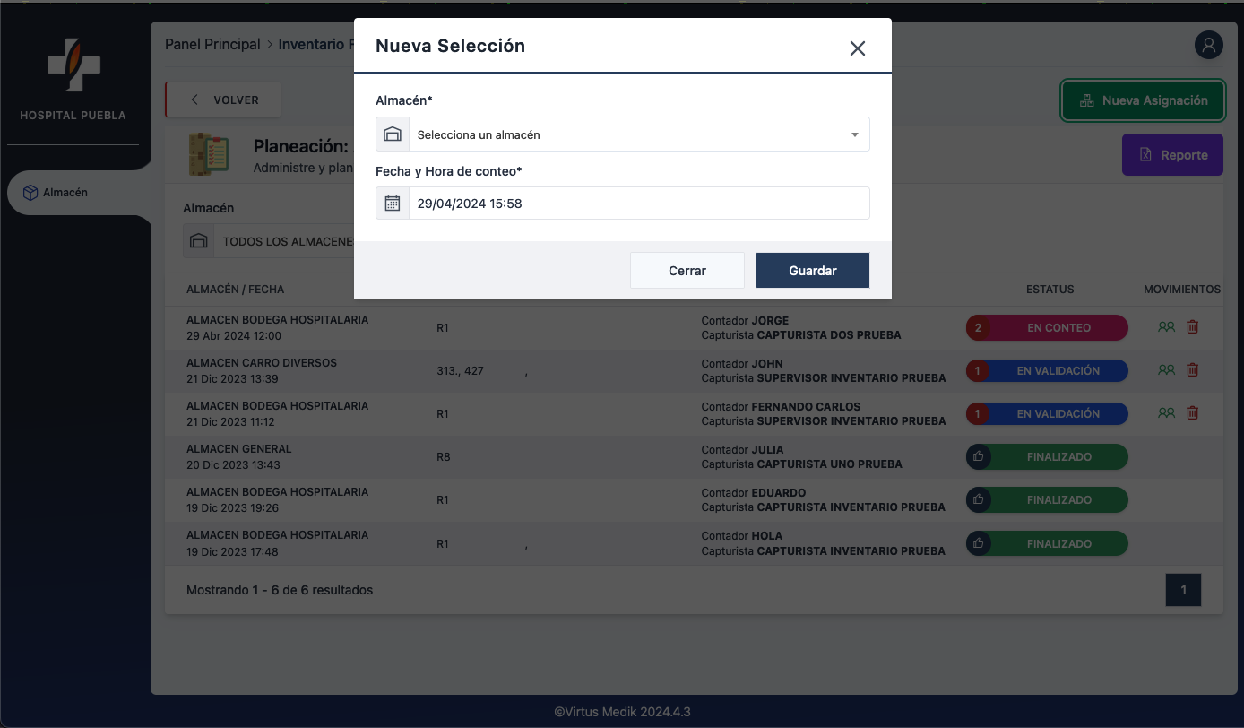 Después de esto vamos al botón verde Nueva Asignación y lo presionamos, ahora seleccionaremos el almacén con el que estaremos trabajando y la fecha del inicio del conteo. Esto hará que se bloqueen las entradas y salidas de este almacén para no alterar los números de los conteos.