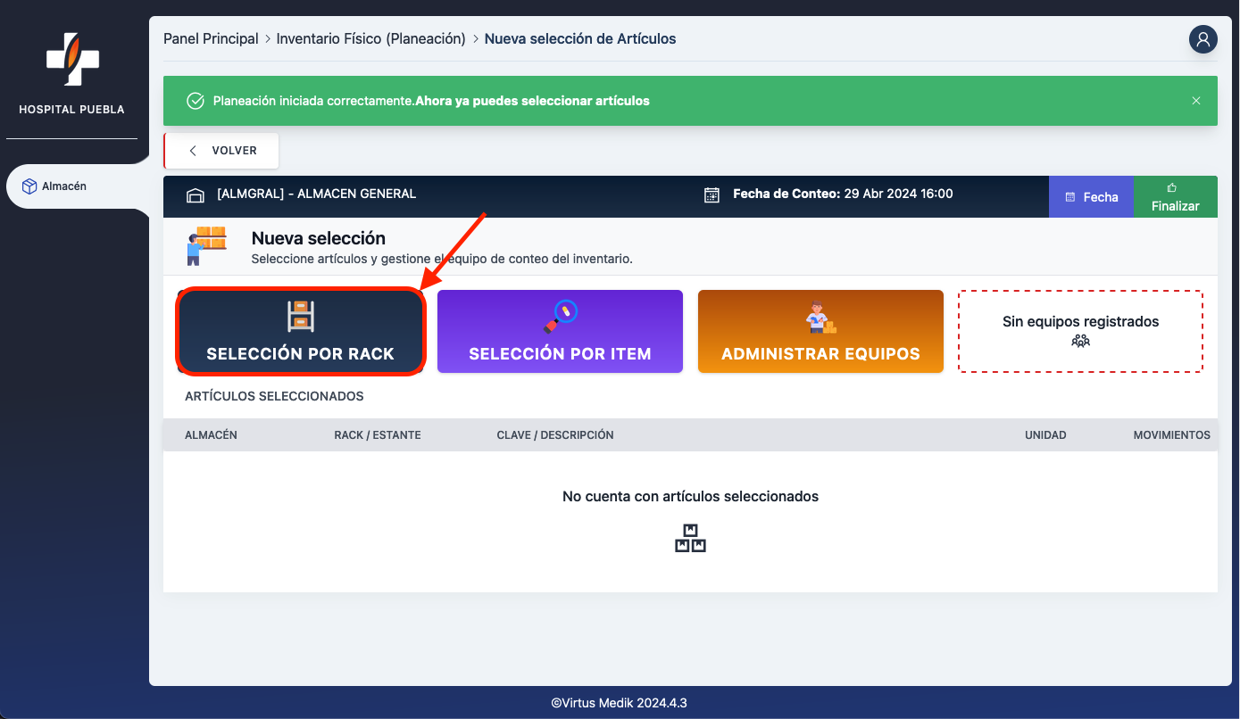 Ahora vamos a seleccionar los racks de artículos con los que trabajaremos, para esto vamos a presionar sobre Selección de Rack.