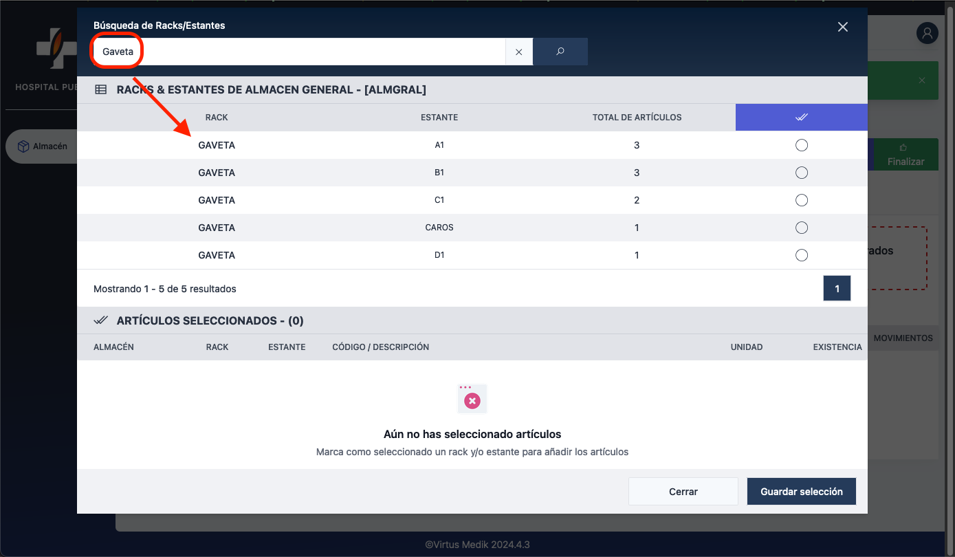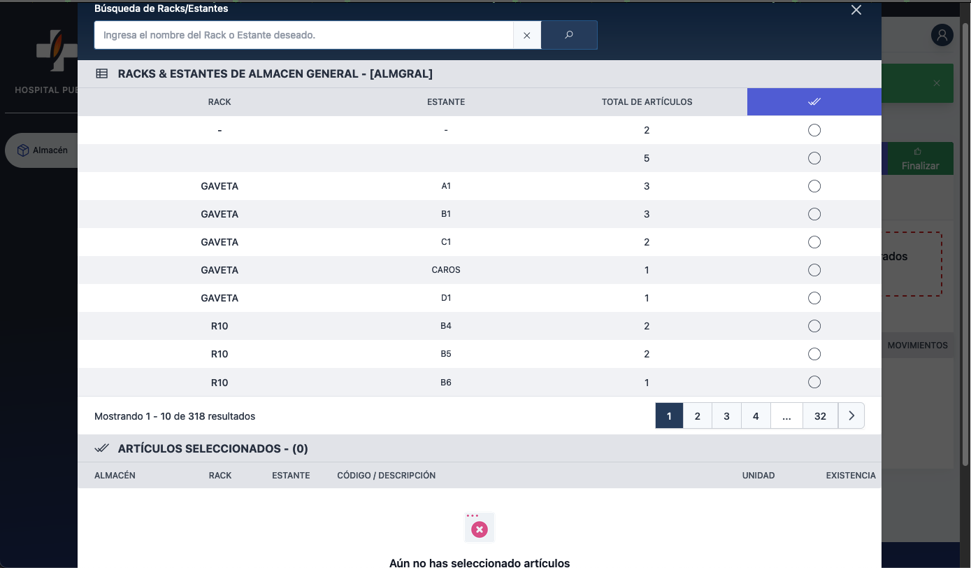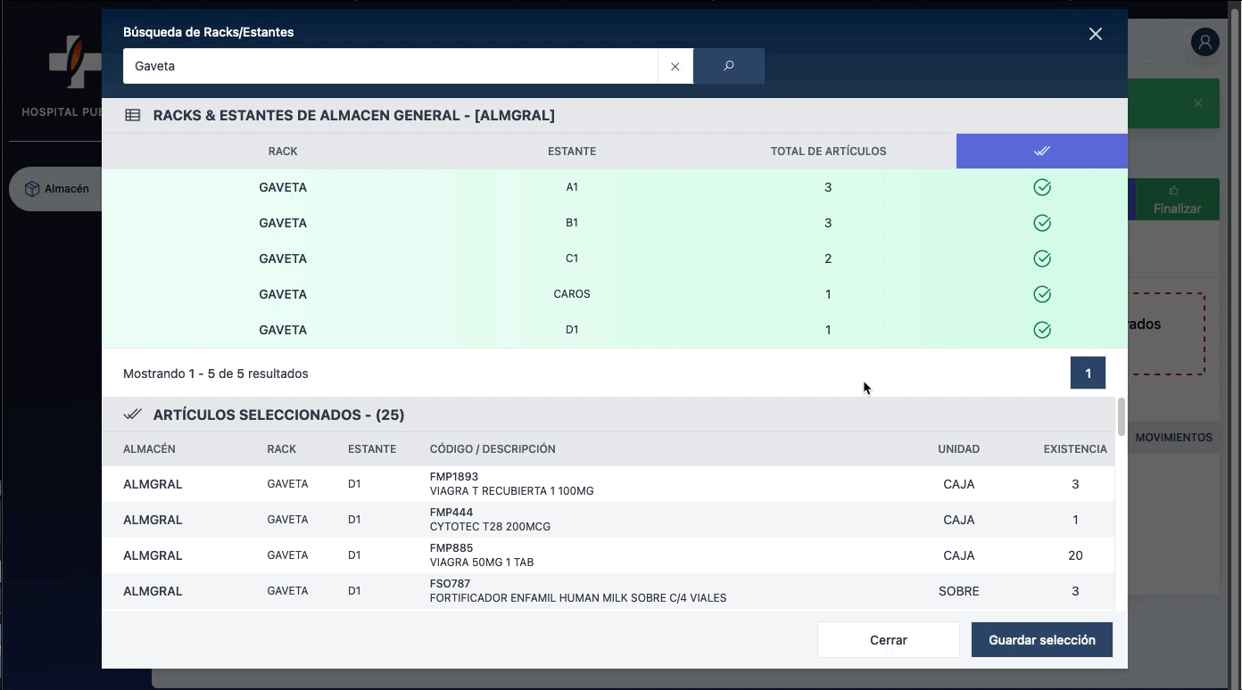 En la parte de abajo se podrán visualizar todos los artículos que contienen los racks seleccionados.