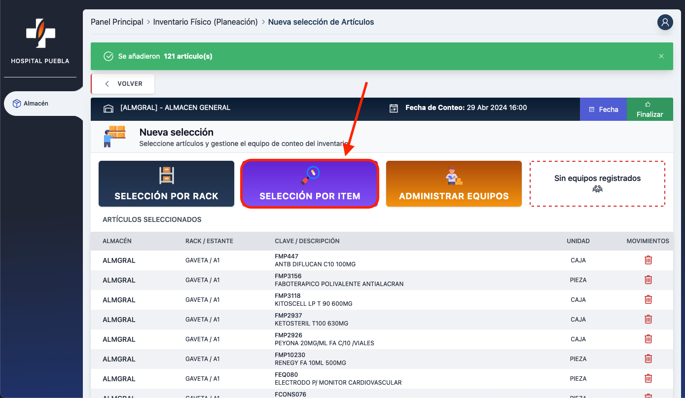 Si quisiéramos seleccionar solo artículos y no racks podemos hacerlo con el botón purpura Selección por Item.