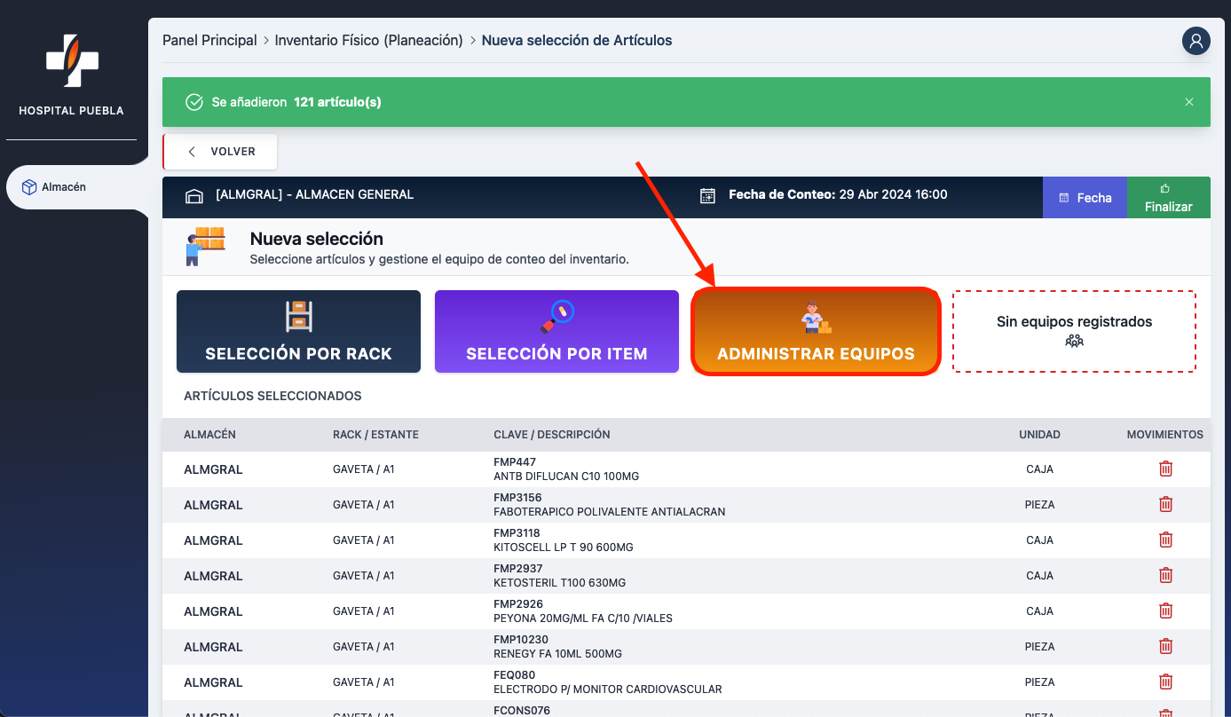 Lo siguiente es crear un equipo, quienes serán 2, uno que capturará los datos en sistema y otra persona que se encargara de contar el articulo físico. Para esto seleccionamos el cuadro naranja Administrar Equipos.