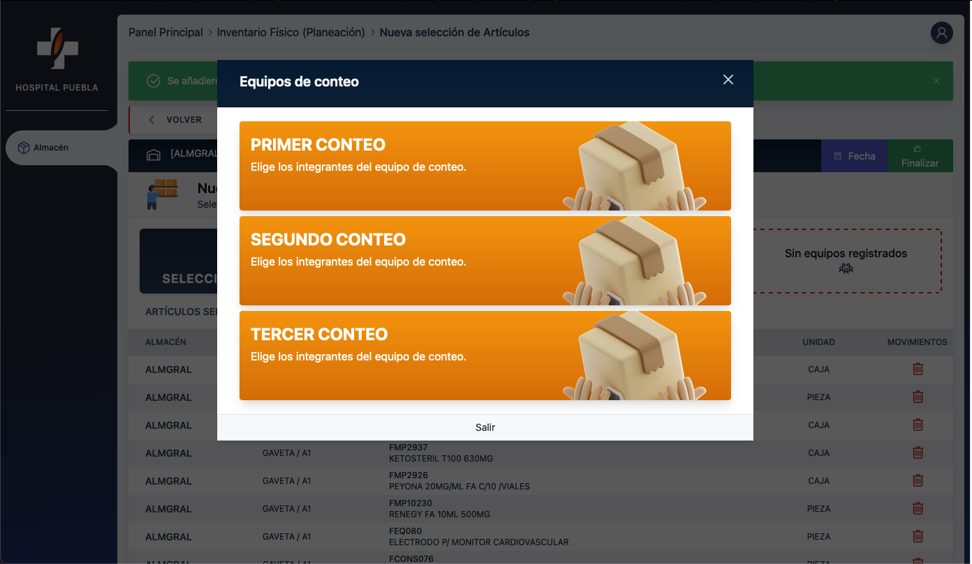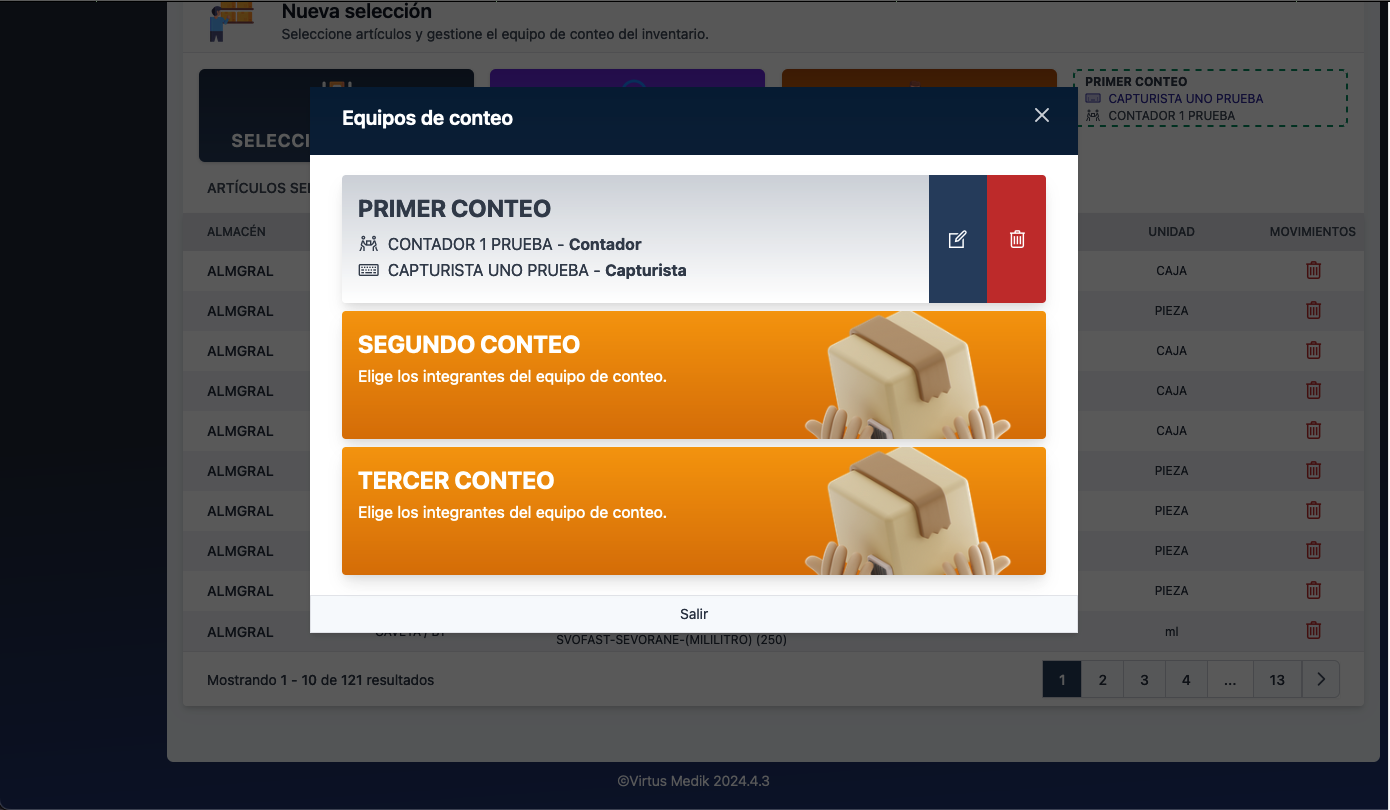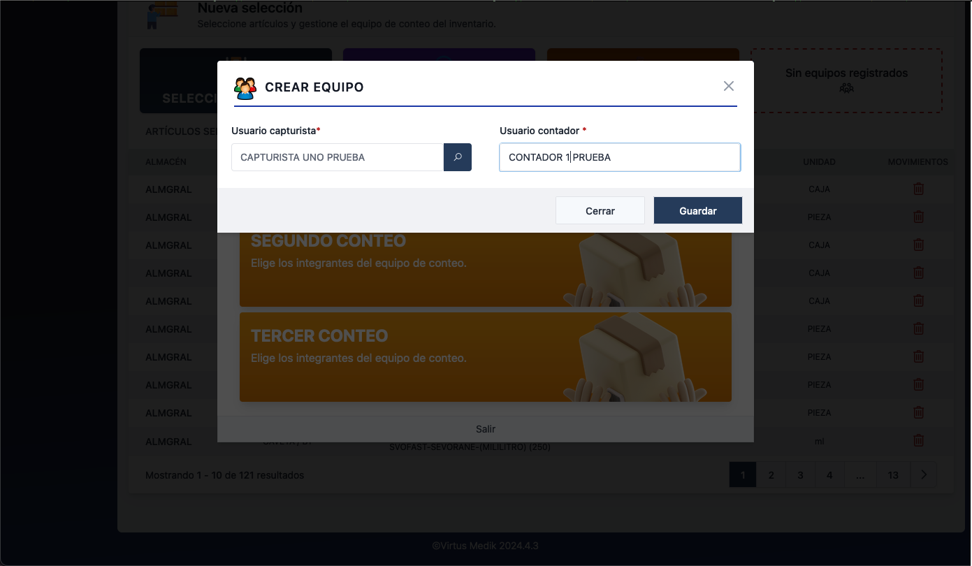 Al terminar presionamos guardar. De esta manera es como asignaremos los equipos para los conteos que se requieran. En pantalla podemos editar (con el botón azul) el equipo ya creado o si es necesario quitarlo solo presionamos el icono rojo para borrarlo.