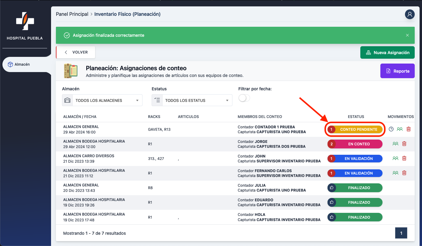 Esto nos regresara a la pantalla donde podemos ver las asignaciones de conteos y podemos ver que el estatus del conteo que acabamos de crear es Conteo pendiente.