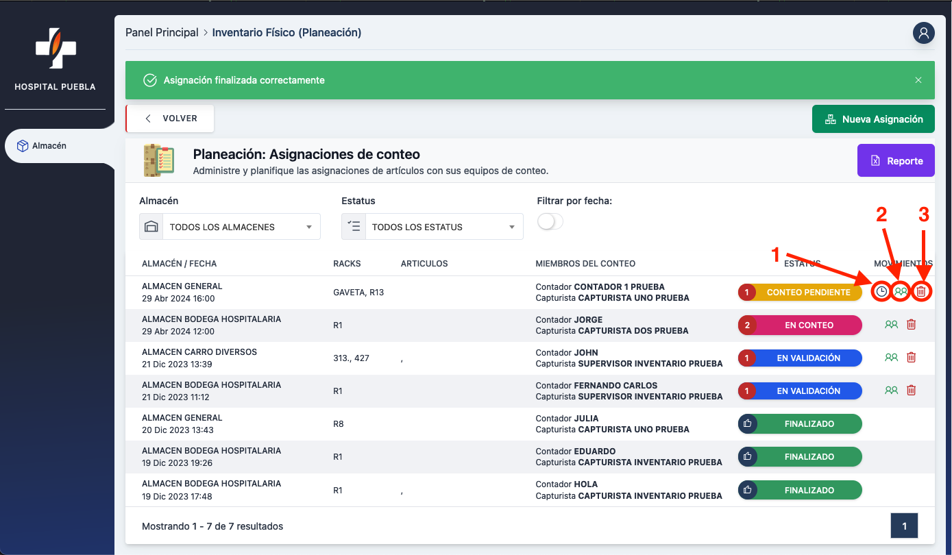 ´ Importante: solo los supervisores y/o administradores de sistema pueden realizar cambios en una vez creada la asignación del conteo, para eso los iconos a la derecha funcionan para editar la fecha (1), los equipos creados (2) y/o eliminar la asignación (3).´
